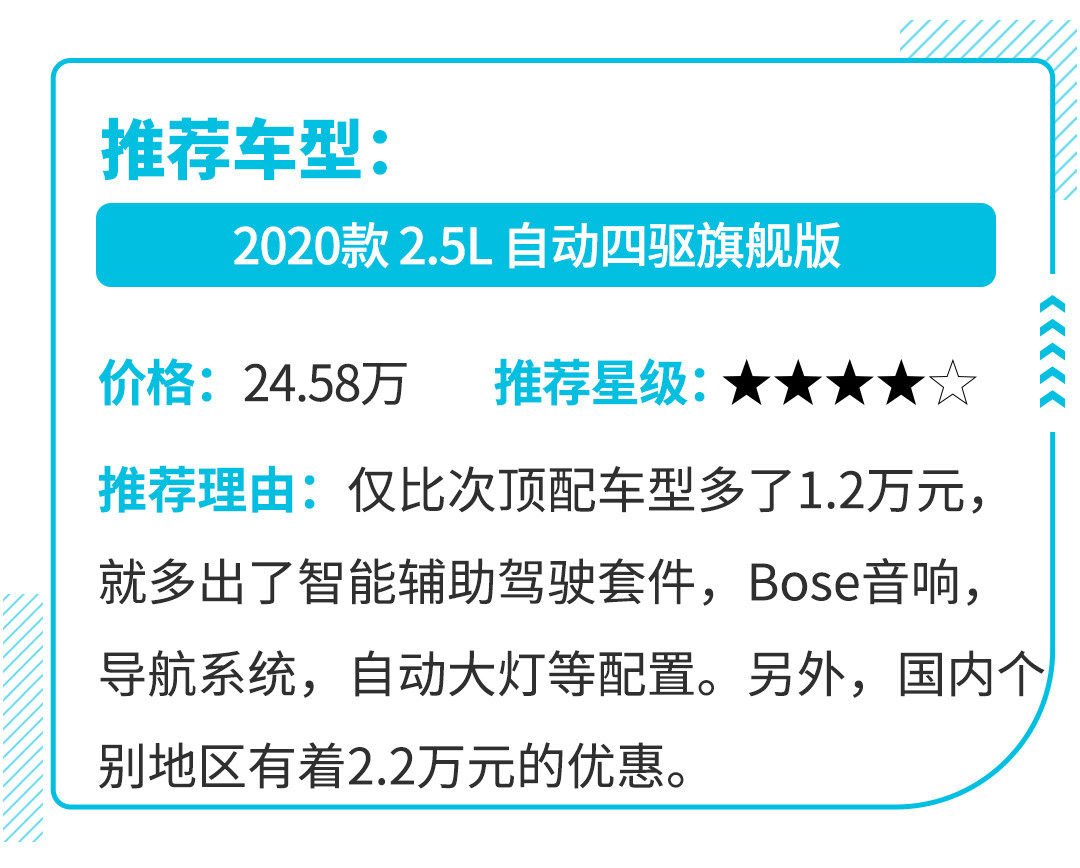在马自达CX-5在售的2020款车款中,买买君更愿意推荐2.5L自动四驱旗舰型,这个车型配置仅比次顶配车型多了1.2万元,就多出了智能辅助驾驶套件,Bose音响,导航系统,自动大灯等配置,另外,以广州地区为例,就有着超过2.2万元现金优惠,十分划算!