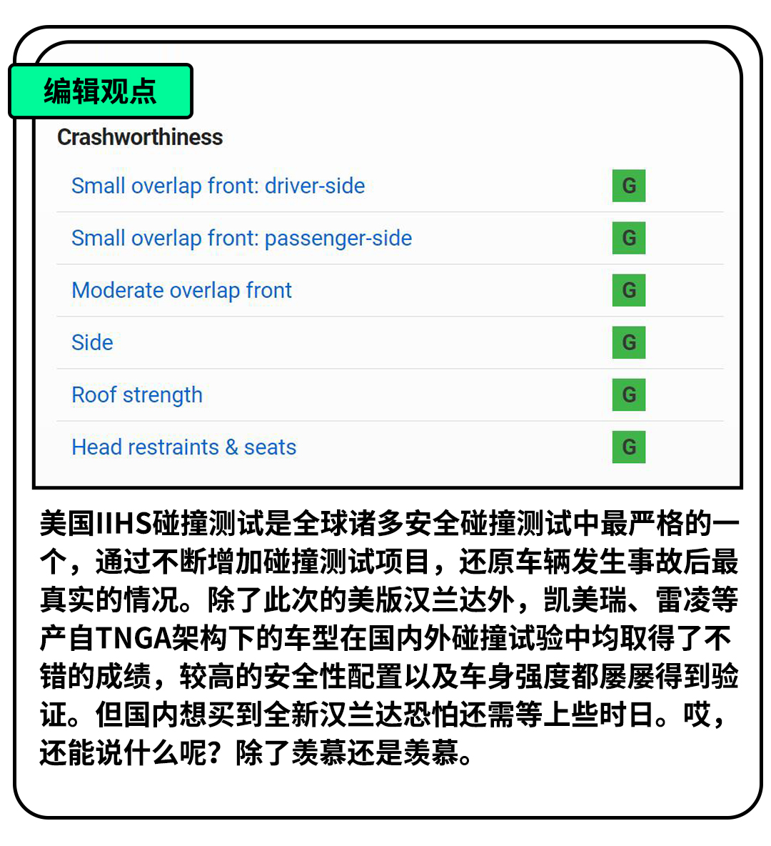 日前根据外媒爆料,美国公路安全保险协会(IIHS)公布了2020款美版汉兰达车型的碰撞成绩。该车在绝大部分细分项目测试中拿到了优秀成绩,最终获得了“Top Safety Pick ”的安全评价。其中25%小面积偏置碰撞、40%正面偏置碰撞、侧面碰撞、车顶抗压强度及头枕/座椅五项测试中,均获得了优秀(G)的成绩。