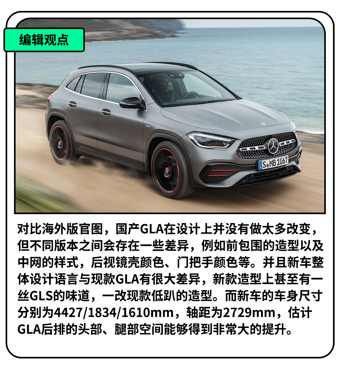 近日,网上公开了一组全新奔驰GLA 180以及GLA 200 4MATIC的申报图。结合此前 GLA 200的信息,大致可以推测出全新奔驰GLA的动力配置,车型搭载区分高低功率版本的1.3T发动机,最大功率分别为136Ps和163Ps,并提供四驱版本。而海外车型还有2.0T版本,不知后续是否有机会引入。