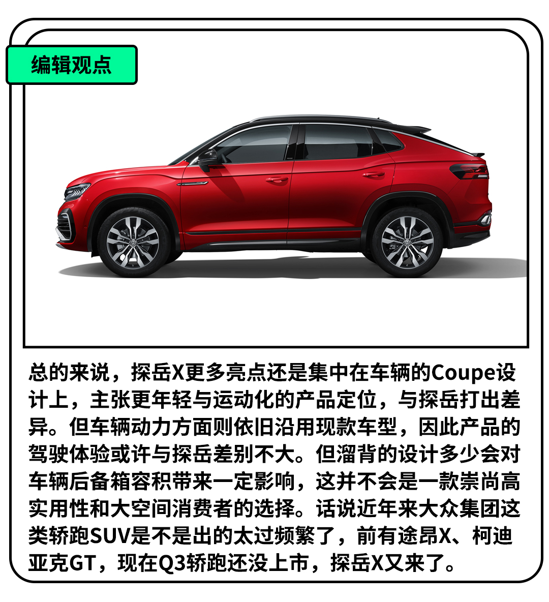 日前一汽-大众正式发布了探岳X的产品官图,并宣称车辆将在2020年中上市,新车目前已经在一汽-大众天津工厂正式下线。探岳X是基于探岳打造的一款轿跑型SUV,与原车最大的区别就在于Coupe的设计风格,以及R-Line运动套件的搭载。相较探岳,新车将取消1.4T版本,仅提供区分高低功率的2.0T车型,最大功率分别为186Ps和220Ps,并匹配的是7速双离合变速箱。