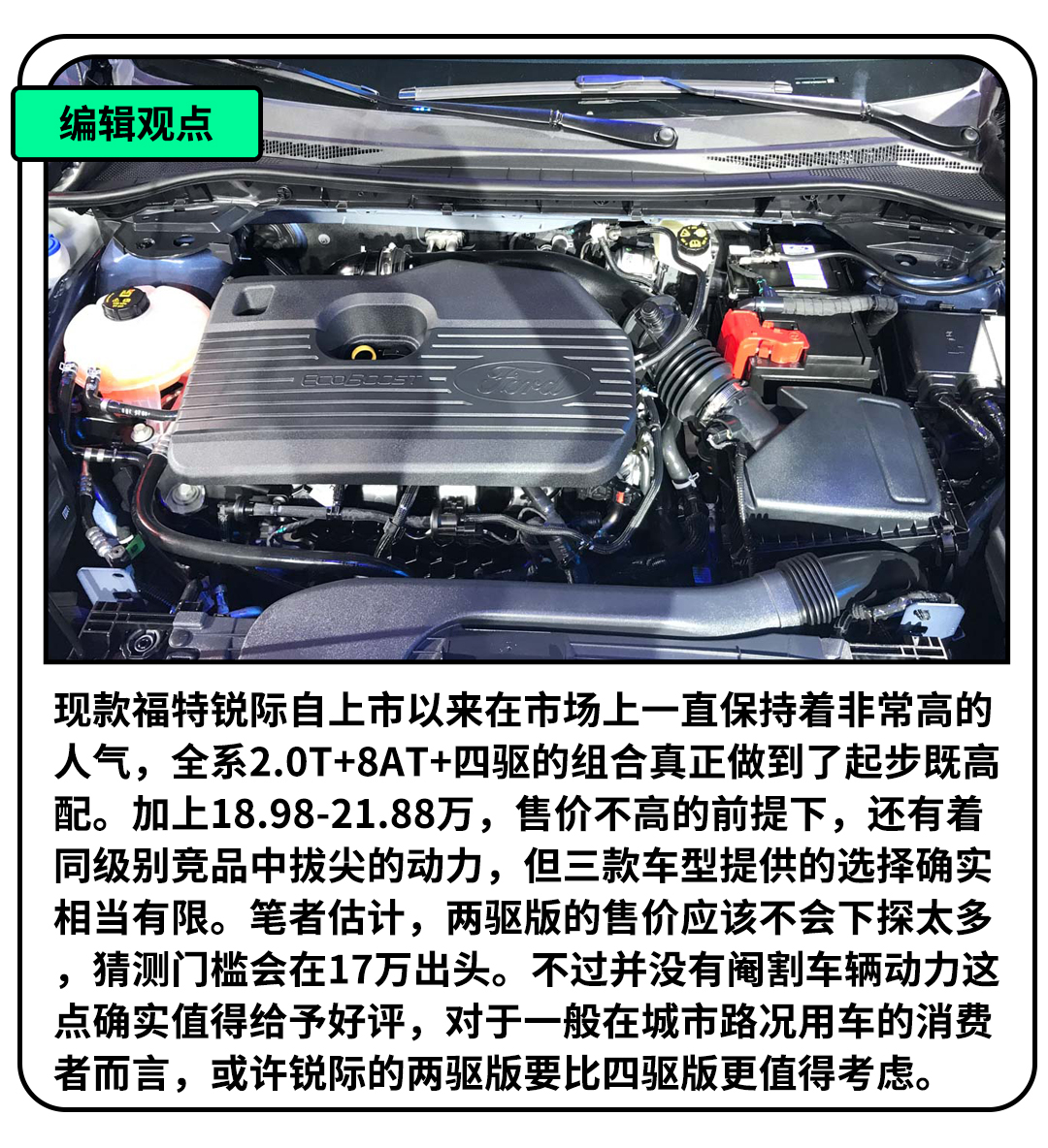 长安官方近日发布消息称,福特锐际将在4月17日推出两驱版本车型,同时售价也会有所下探。车辆虽然采用前驱布局,但动力上还将继续搭载2.0T发动机以及8速手自一体变速箱。现在我只关心两驱版售价能给我多大的诱惑。