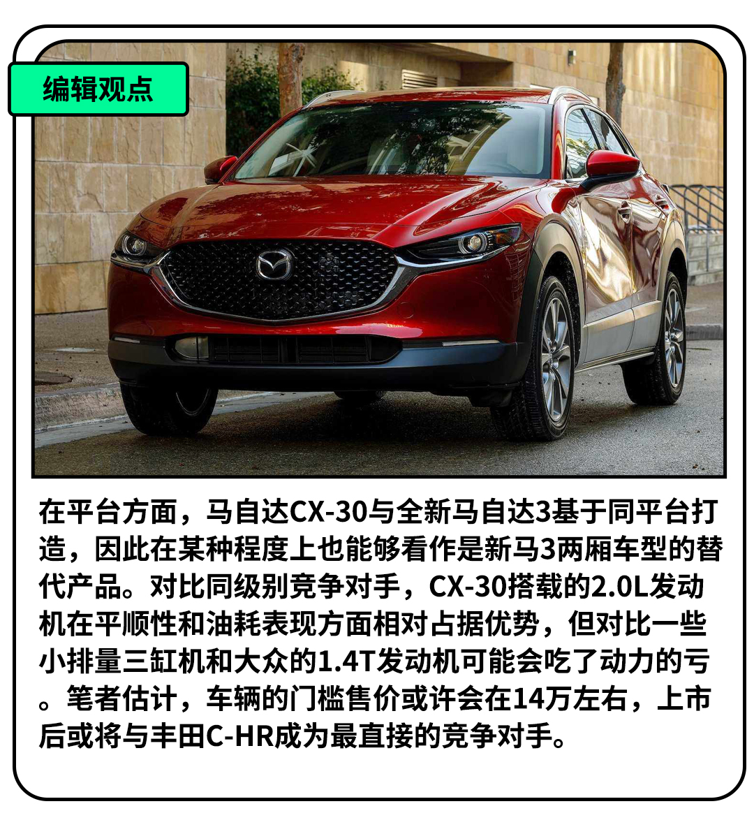 根据相关渠道获得的消息,长安马自达即将国产马自达CX-30,并且有机会在6月份正式上市(不排除有跳票的可能性)。结合此前工信部公开的长安马自达CX-30申报信息,CX-30的车身尺寸为4395/1797/1545mm,轴距为2653mm,在产品定位上相较CX-4以及CX-5更低,但全系提供2.0L发动机。