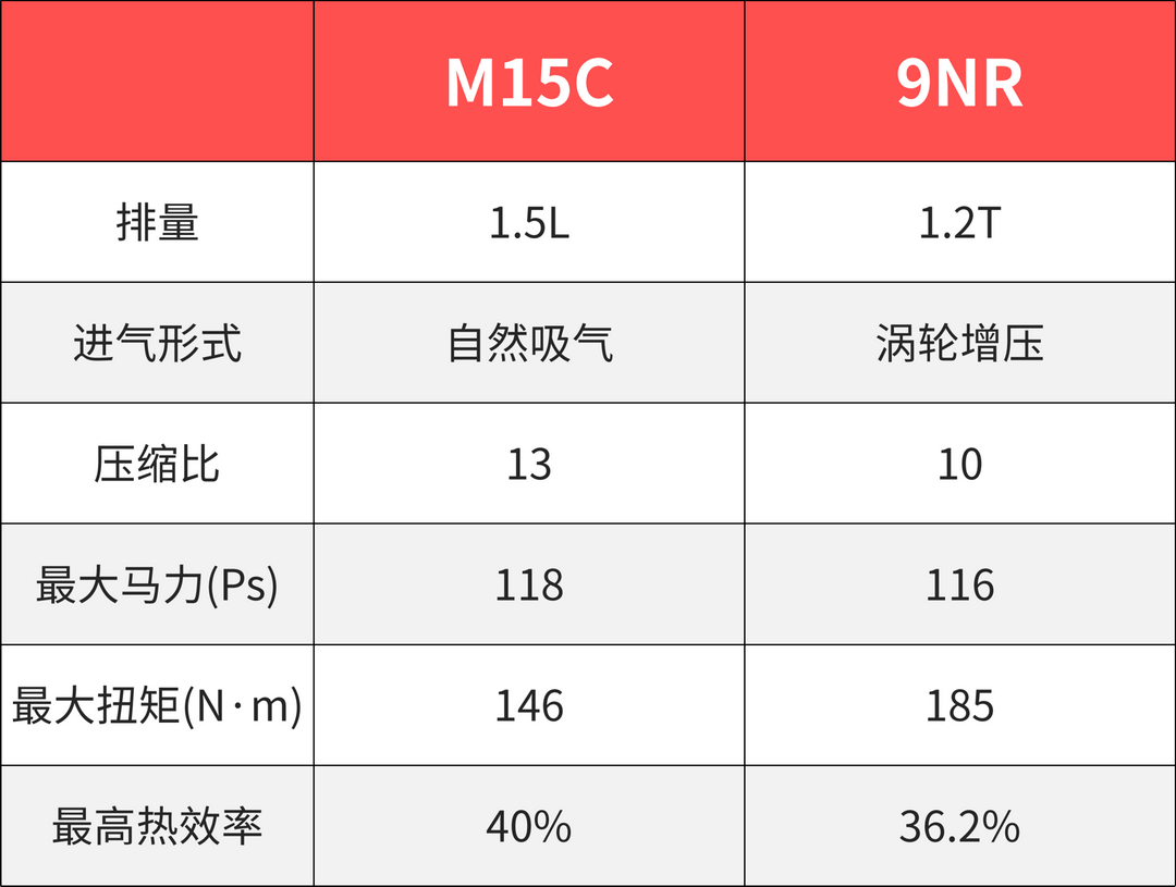 别看这是一台1.5L的三缸自吸发动机,仔细看看它的参数,你能发现它并不简单,它的最大功率118匹马力,比NR系列的1.2T多了2匹。它的压缩比高达13:1,与马自达的创驰蓝天系列发动机一样。高压缩比意味着高燃油效率,这台1.5L三缸自吸发动机的最高热效率居然暴涨到40%,绝对是世界顶级的水平。