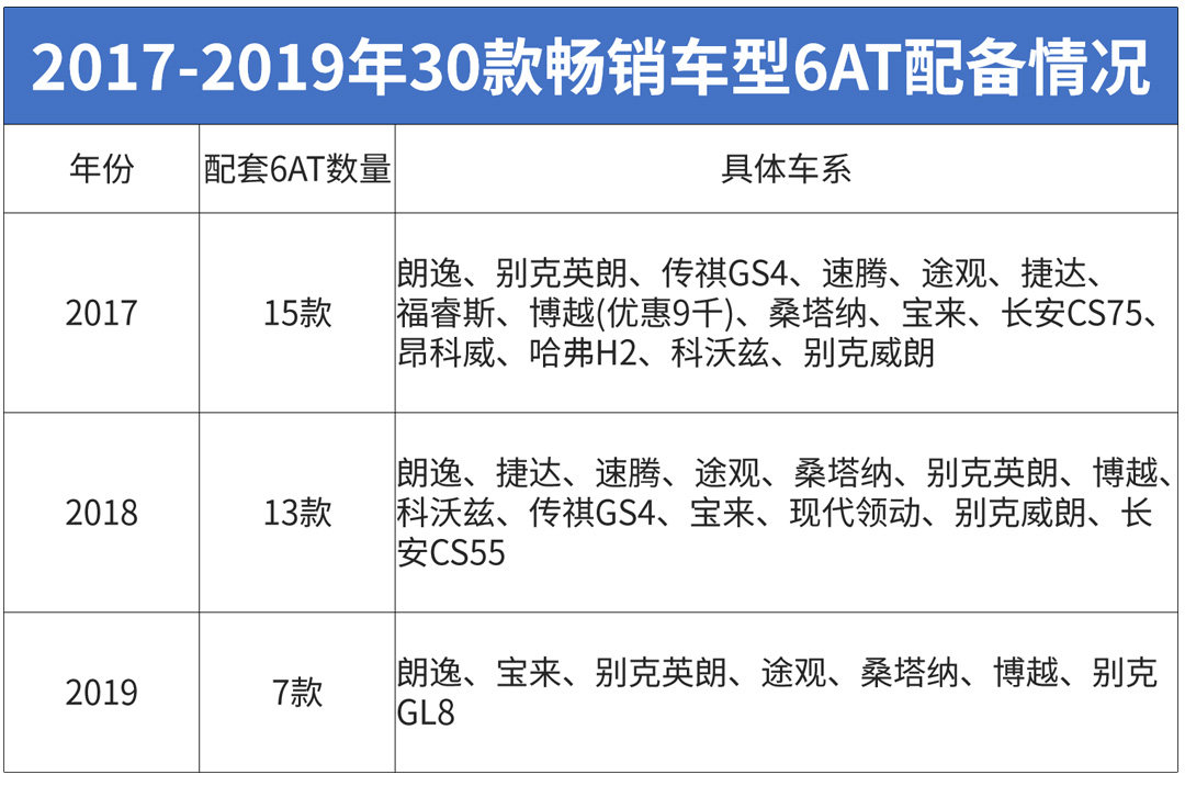 爱信6AT的成本太高了,一台的价格在9200元左右,虽然表现稳定,但低挡位的油耗偏高。车企完全可以用CVT、DCT这些成本低一点的变速箱取代它,事实上车企也是这么做的。