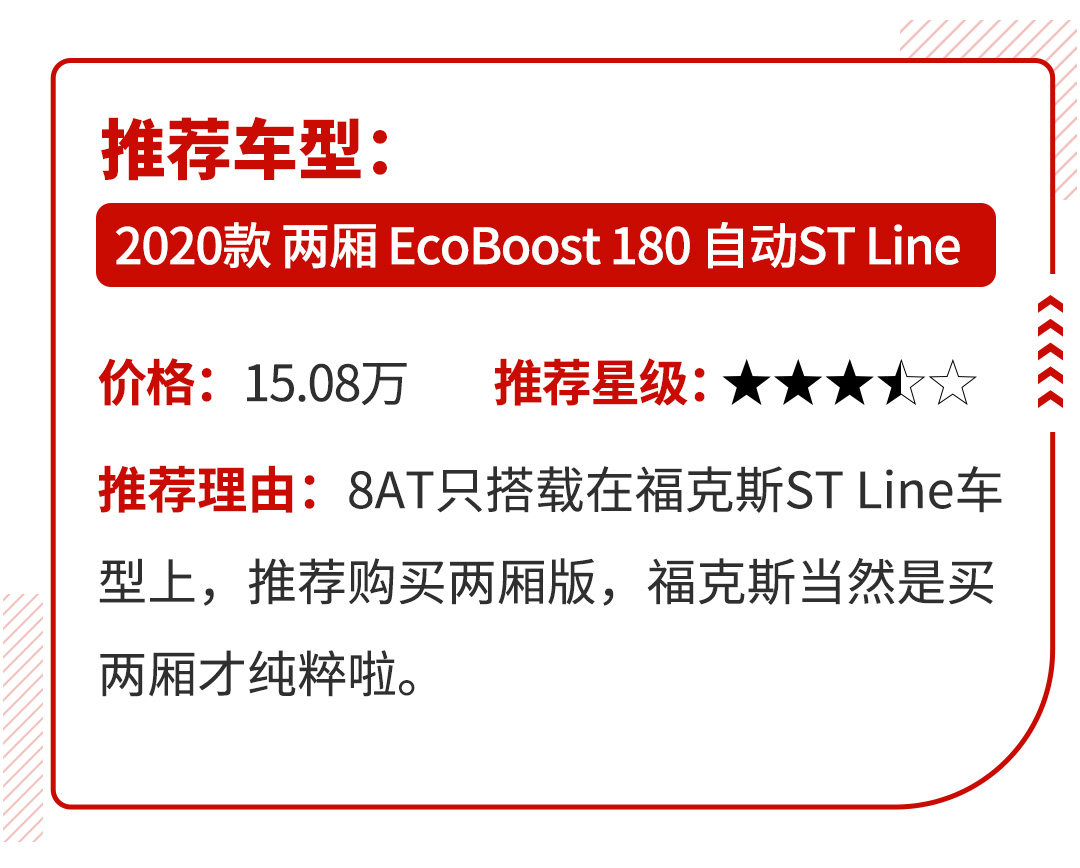 福克斯是紧凑型家轿中为数不多搭载8AT变速箱的车型,同级别中有优势,8AT甚至在一定程度上消除了三缸发动机带来的影响。凭借着俏皮有型的外观,新福克斯在上市之后为福特注入了新活力。如果你喜欢小钢炮,又能接受三缸机,福克斯是个不错的选择。