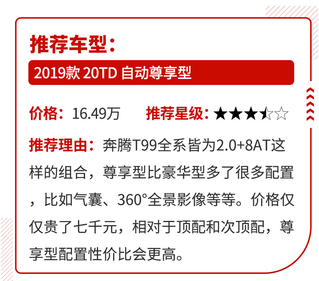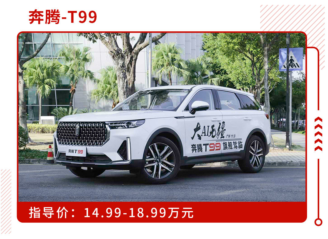 奔腾T99最近也挺火的,十五万不到的国产中型SUV,搭载了一汽自主研发的2.0T发动机,变速箱为盛瑞8AT,空间大、配置高,难怪一上市便崭露头角。