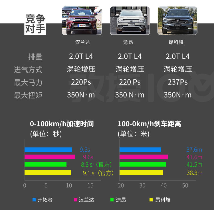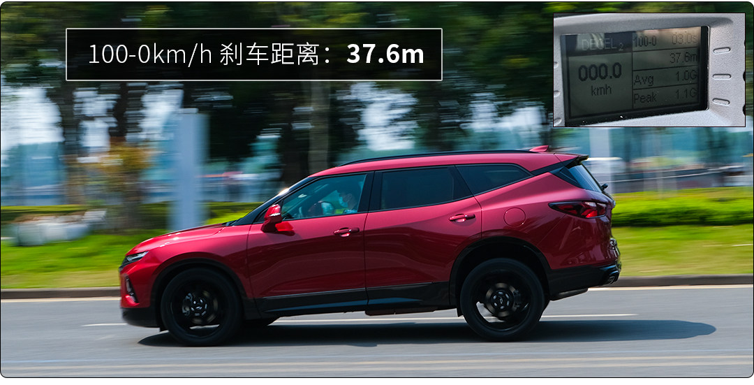 虽然开拓者刹车点头的现象是比较明显,但它的刹车性能是毋庸置疑的,甚至比很多紧凑型SUV要很好多,37.6m的成绩也是竞品中最好的成绩了。