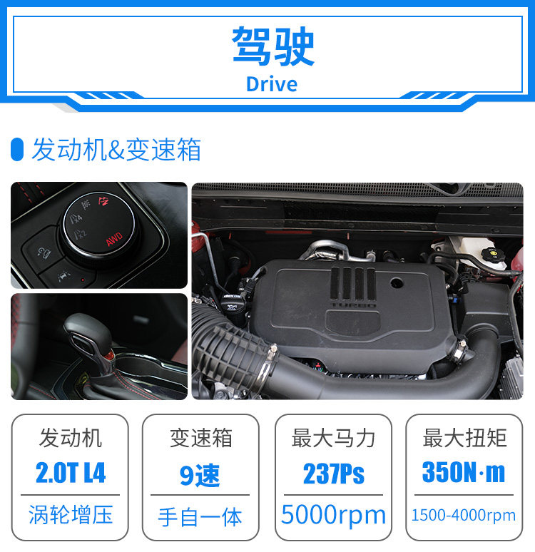 动力总成反而是开拓者最不值得谈论的一部分,因为大家对通用这套2.0T+9AT组合已经很是了解了,凯迪拉克、别克等高端车型上都会采用,可变缸技术在油耗、动力上的平衡也已经得到了大家的认可。2.0T发动机在动力参数上与竞品车型处于同一水平,而通用的9AT也能在100km/h以下实现9挡切换,适合中国道理环境使用。