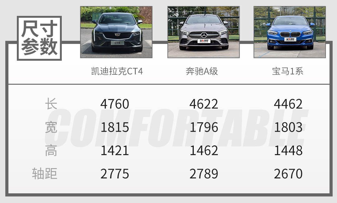 CT4还是该价位下唯一一款中型车尺寸的车型,尺寸大幅度领先这价位下的BBA紧凑型轿车。