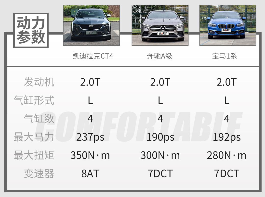 凯迪拉克CT4是这价位下唯一一台2.0T+8AT+后驱的车型,其核心竞品车型都是前驱车,而且2.0T+8AT也是同价位下唯一的动力系统。凯迪拉克有一个优良传统,那就是发动机不分高低功率,所有2.0T发动机都是高功率版本,他们之间可能因为排放标准的原因,马力有所出入,但只是差了几匹,绝不是高低功率那种差了40-50匹的差距。