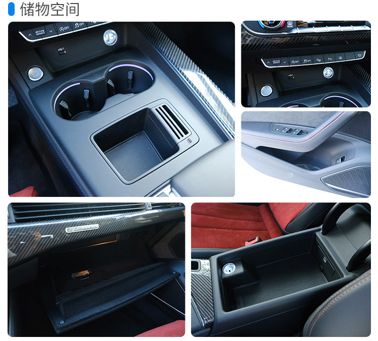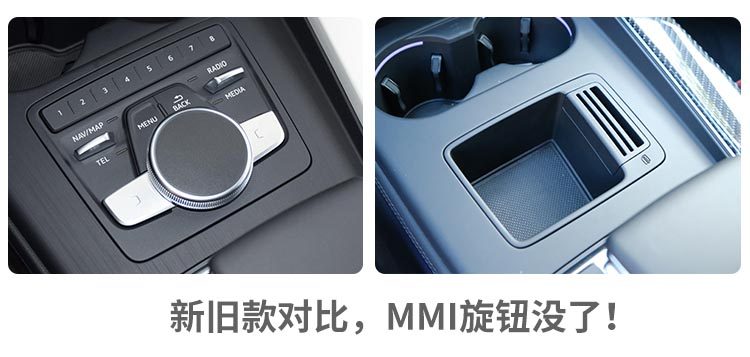 储物空间方面,全车上下的储物空间分布比较一般,中央扶手箱打开后的储物空间也是偏小,只是挡把前方的MMI控制旋钮换成了一个小小的储物格,可以放一些小件物品和停车卡,在这个方面倒是有进步。
