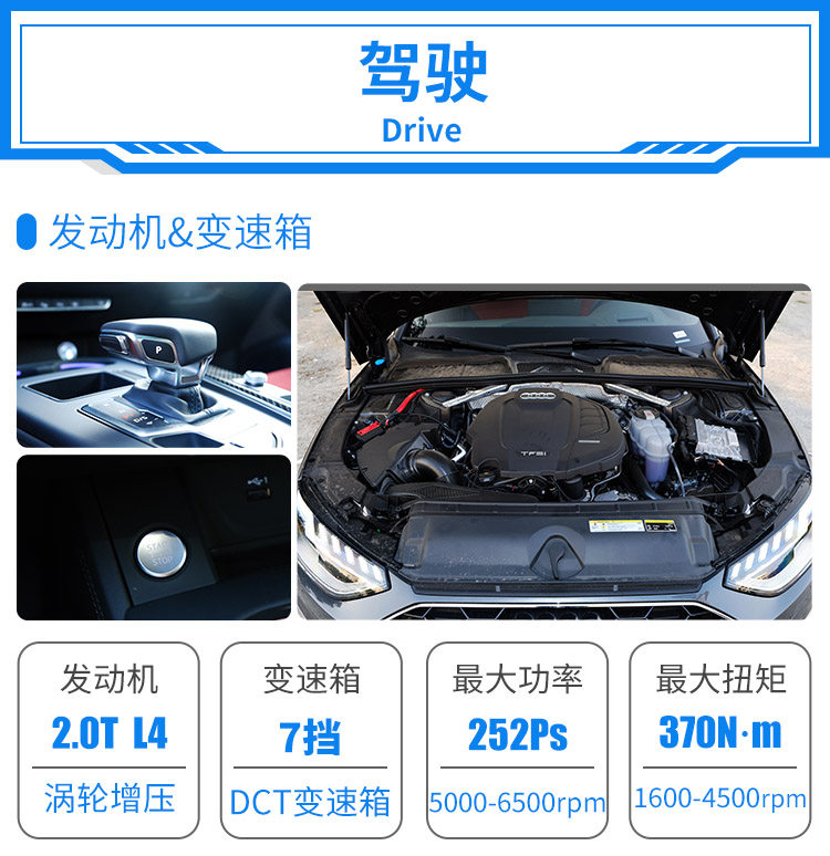动力上,中期改款之后的奥迪A4L已经摒弃了1.4T发动机,全系采用了2.0T的发动机,试驾车型为45 TFSI,也就是顶配版本,最大马力252Ps,峰值扭矩为370N·m,动力匹配的是经典的7速双离合变速箱。当然,奥迪A4L的走量车型并不是这个高功率版本,而是动力为190Ps的40 TFSI版本。