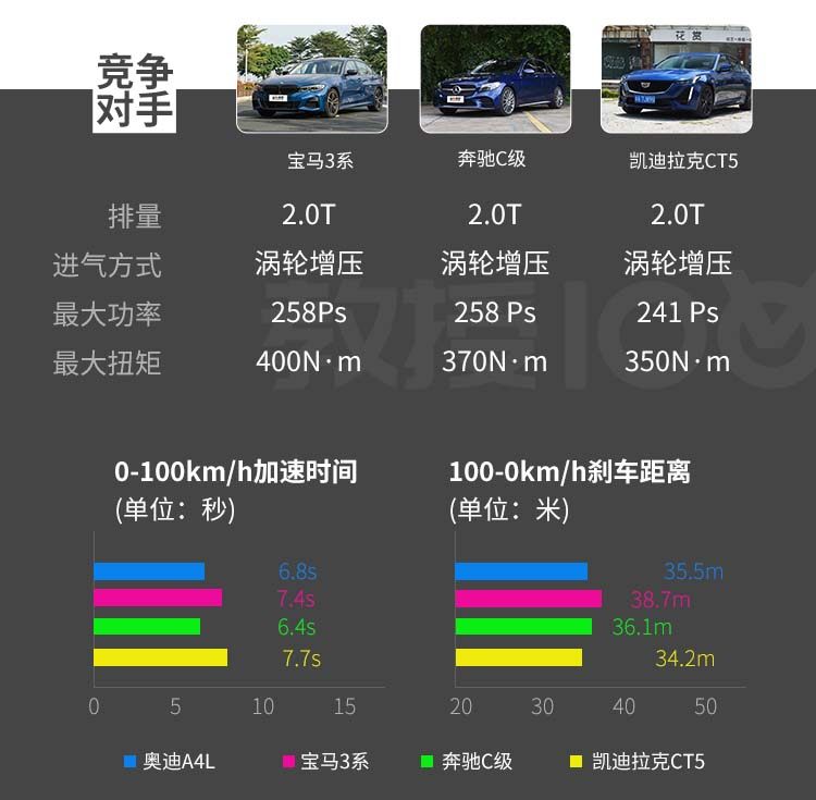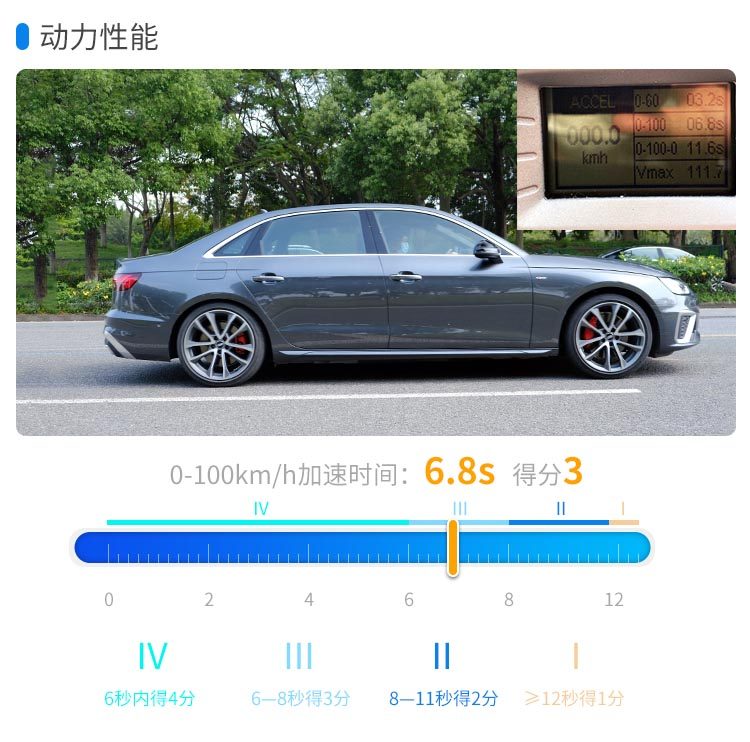 在实测中,奥迪A4L的动力在同级别中算是一个非常出色的成绩,百公里加速时间与官方6.6s的成绩并无太大出入。而在刹车测试中,100-0km/刹车距离仅为35.5m,制动性能极其出色。