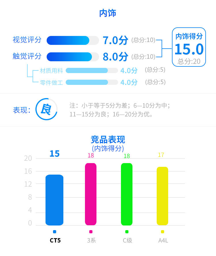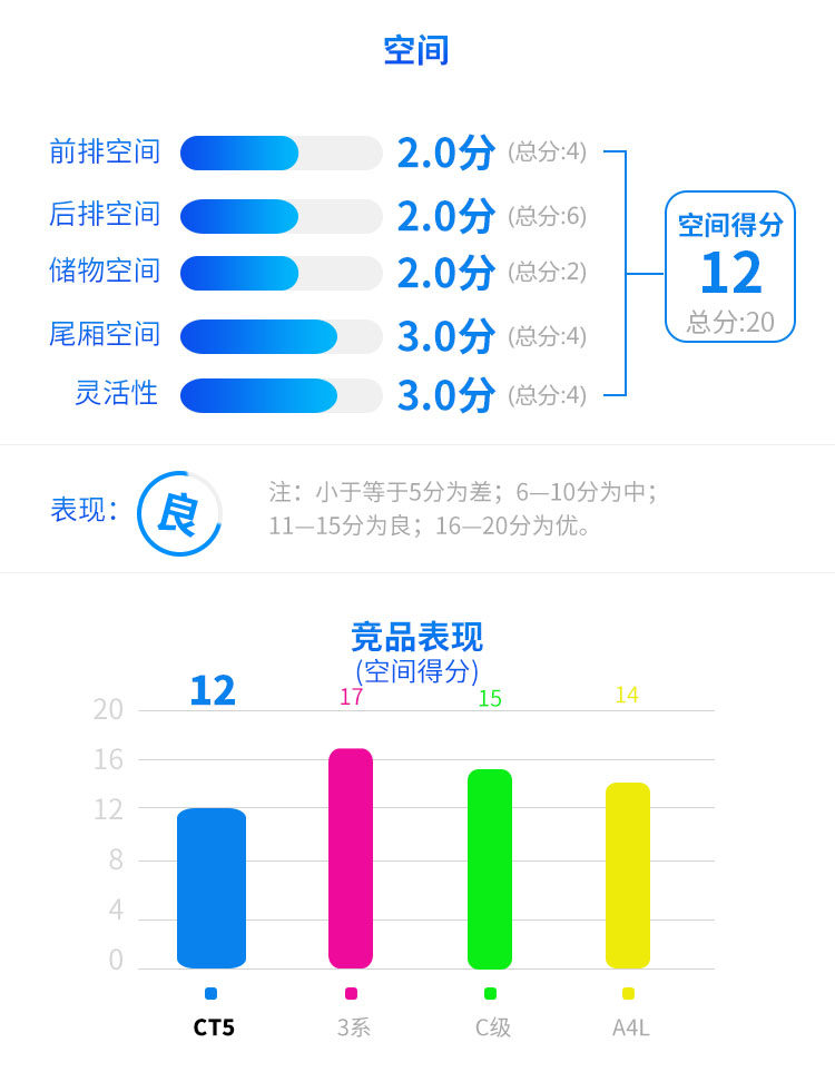 空间总结:凯迪拉克CT5的尺寸优势并没有让它成为同级“空间王”,它的乘坐空间表现无法战胜奥迪A4L、宝马长轴距3系等竞争对手,可见体型大与空间大之间并不总是划等号的。