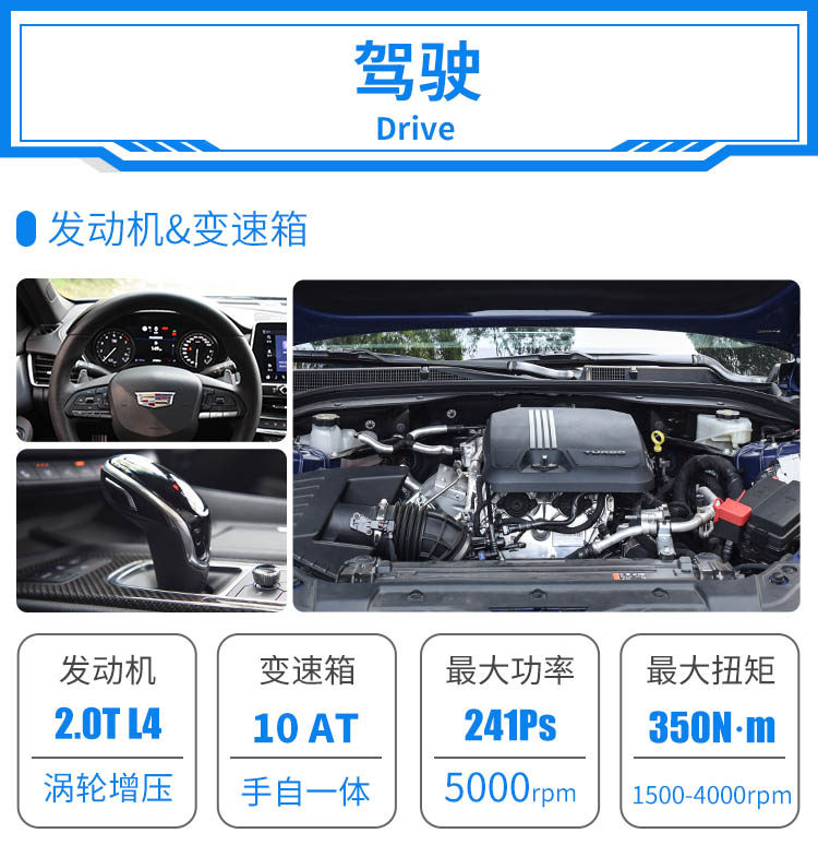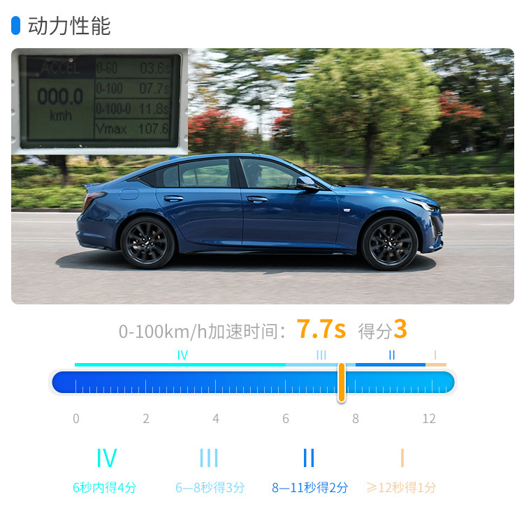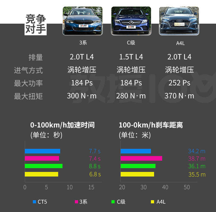 凯迪拉克CT5搭载的2.0T涡轮增压L4发动机可输出最高241匹马力和350牛·米扭矩,且车系中并没有因配置不同而分出“高、低功率”版本,因此在与同级车型的动力对比中处于上风。不过经过教授实测,CT5的0-100km/h加速成绩为7.7秒,动力参数的优势并未转化为实际加速性能的优势。