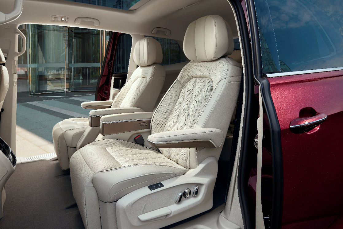 Viloran的Captain Chair行政级第二排礼宾座椅采用高档的真皮打孔座椅,优雅的菱形格纹理,辅以滚边与绗缝工艺,体现精致与档次感。座椅集电动调节(靠背及腿托)、主动通风功能、加热功能于一身,更有3种模式x3种档位气动按摩功能,为二排贵宾带来尊享体验。双贵宾行政座椅采用头等舱座椅中央扶手,头枕采用航空睡眠头枕,不仅支持不同高度调节,还特别增加了头枕侧翼角度调节功能,有效提高对乘员头部的包裹性和支撑度,满足贵宾的休息放松需求。此外,座椅根据人体工程学设计,不仅带来媲美头等舱的坐享舒适,同时在高速行驶时提供对人体的支撑和保护,助力自在从容的商务之旅。