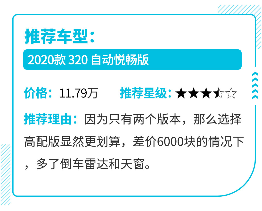此次上市的1.5L四缸车型,共推出两个版本,分别为320自动悦享版和320自动悦畅版,价格分别为11.19万元和11.79万元,车身颜色包含有天真白、霸道黑、任性红、高冷灰、低调灰,一共五种可供选择。