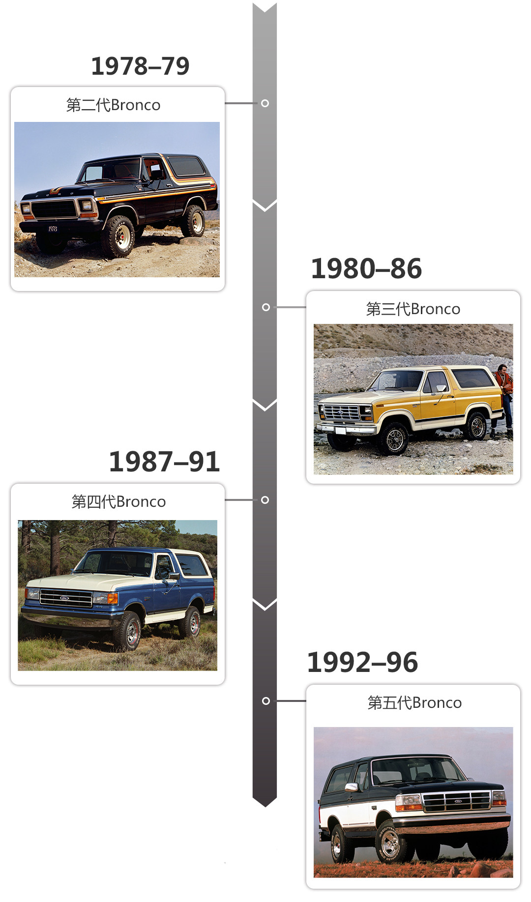 上文提到,初代Suburban推出之后当时人们并没有现在这种“SUV”的概念,人们的认知里,把类似于“SUV”的车型归类为越野车,具有很浓烈的功能属性,而SUV这个概念真正兴起要到90年代,这个时候Bronco逐渐退出舞台。