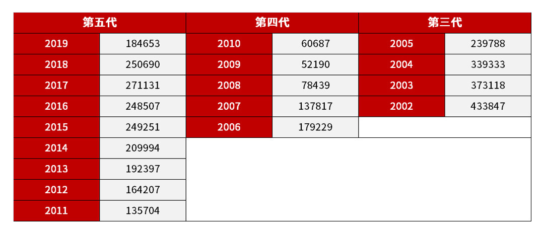 我们对比一下丰田RAV4和福特Escape的销量,RAV4前两代(1994-2005)的销量都是达不到10万辆以上,一直到第三代(2006),RAV4终于看懂竞争对手福特Escape的打法,才逐渐有起色;而福特Escape可以说是一出道就一路高歌,巅峰时期连续4年销量破30万,一直到前两年也有着相当火爆的市场表现。