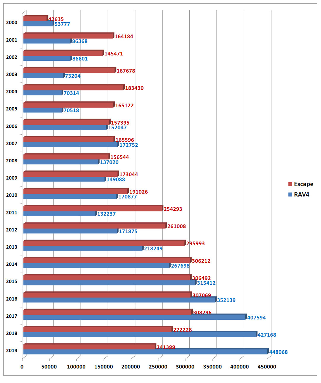 其实别看现在RAV4现在多么风光,丰田RAV4真正超越福特Escape是在2015年后,也就是第四代的中期改款后,才成为美国市场城市SUV的领导者,在那之前的15年都是被福特Escape压制住的。