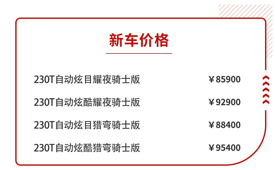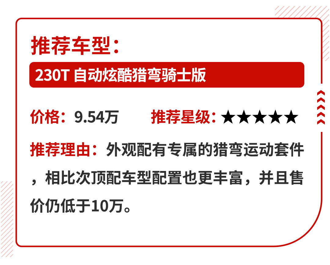 因此猎弯骑士版更值得选择,而虽然炫目猎弯骑士版(8.84万元)和炫酷猎弯骑士版(9.54万元)的差价为7000元,但教授更推荐230T 自动炫酷猎弯骑士版。首先该版本的售价不超过10万元,和同级车型相比,其拥有专属的运动套件已是性价比较高;其次与炫目骑士版相比,它在外观、内饰、安全装备以及辅助驾驶等方面的配置都要更丰富,例如全LED大灯、前后流水式转向灯、真皮方向盘,还有更实用的电动后视镜调节和副驾驶电动调节。