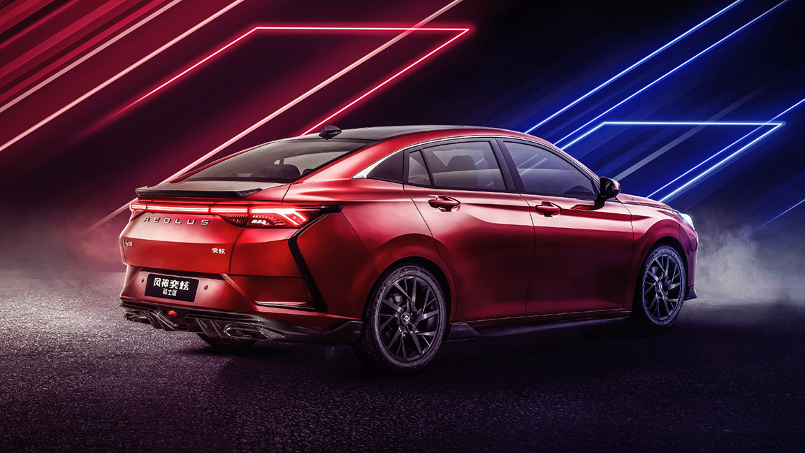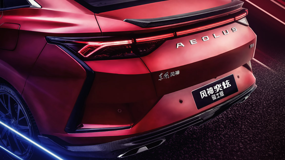 车尾部分风神奕炫采用的是燕尾式灯带和流水转向灯,普通车型已经带有熏黑处理,夜间点亮效果不错。而风神奕炫骑士版在此基础上也对两侧“獠牙”饰条进行黑化,其次在上/下方分别加入了碳纤维小尾翼和后扰流,整体更有运动气息。