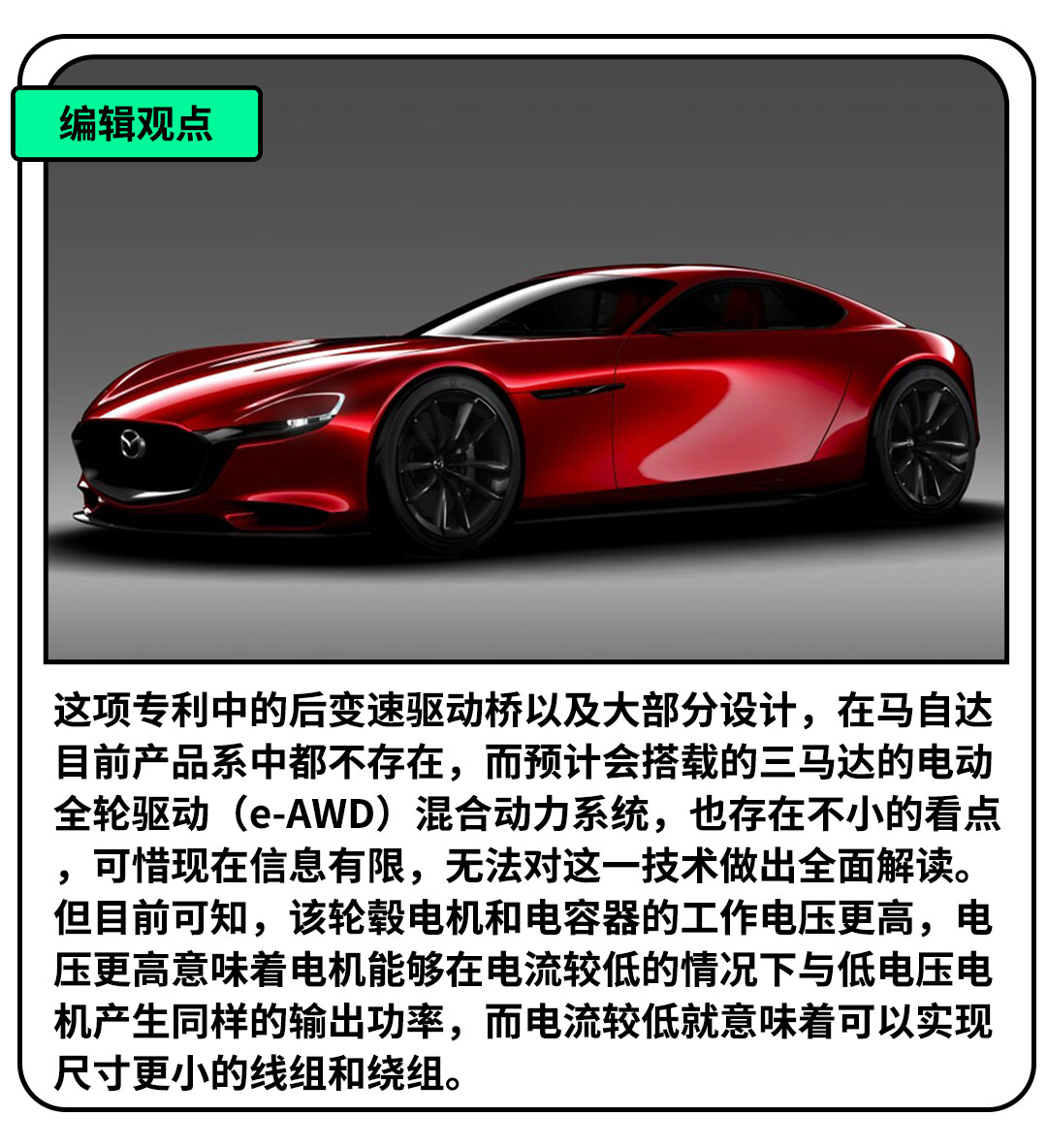 具外媒报道,在马自达的一份专利申请文件中提到,他们正在考虑推出利用电容器驱动的轮毂电机,并搭载在一款全新前置后驱车型身上,整套动力由发动机、电机、两个轮毂电机以及一个小型锂离子电池组成。这种混合动力装置可能专为马自达计划推出的RX-9轿跑设计。