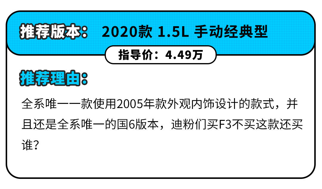 故若不是预算不足并为解决用车刚需,我个人不建议你入手这款车。不过,F3经典款生产十多年,老一辈人对其也产生了感情,加之4.49万的超低售价比当年还便宜,因此F3经典款在三四线城市和农村还是很有市场的。换代?我想大几率不会有了。