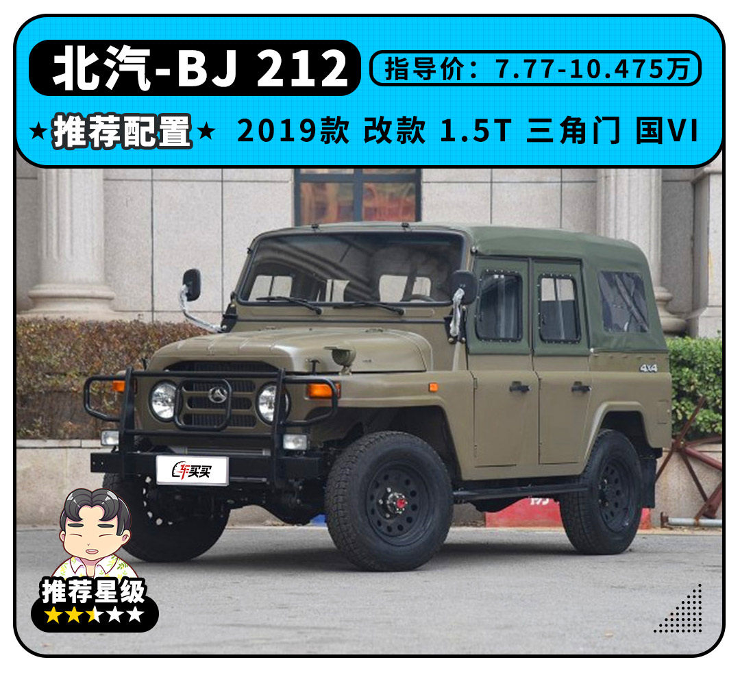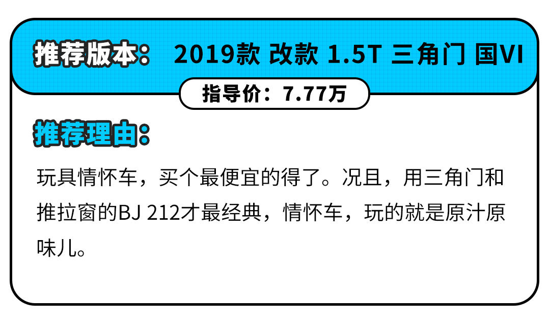 谁说自主品牌就没有超过50年历史且是正向研发的车?BJ 212第一个不服。BJ 212从1965年生产至今,完全由我国北汽正向研发,超过半个世纪以来,其整体外观内饰都没啥大的改动,甚至连很有年代感的三角门+推拉窗款式也保留下来。