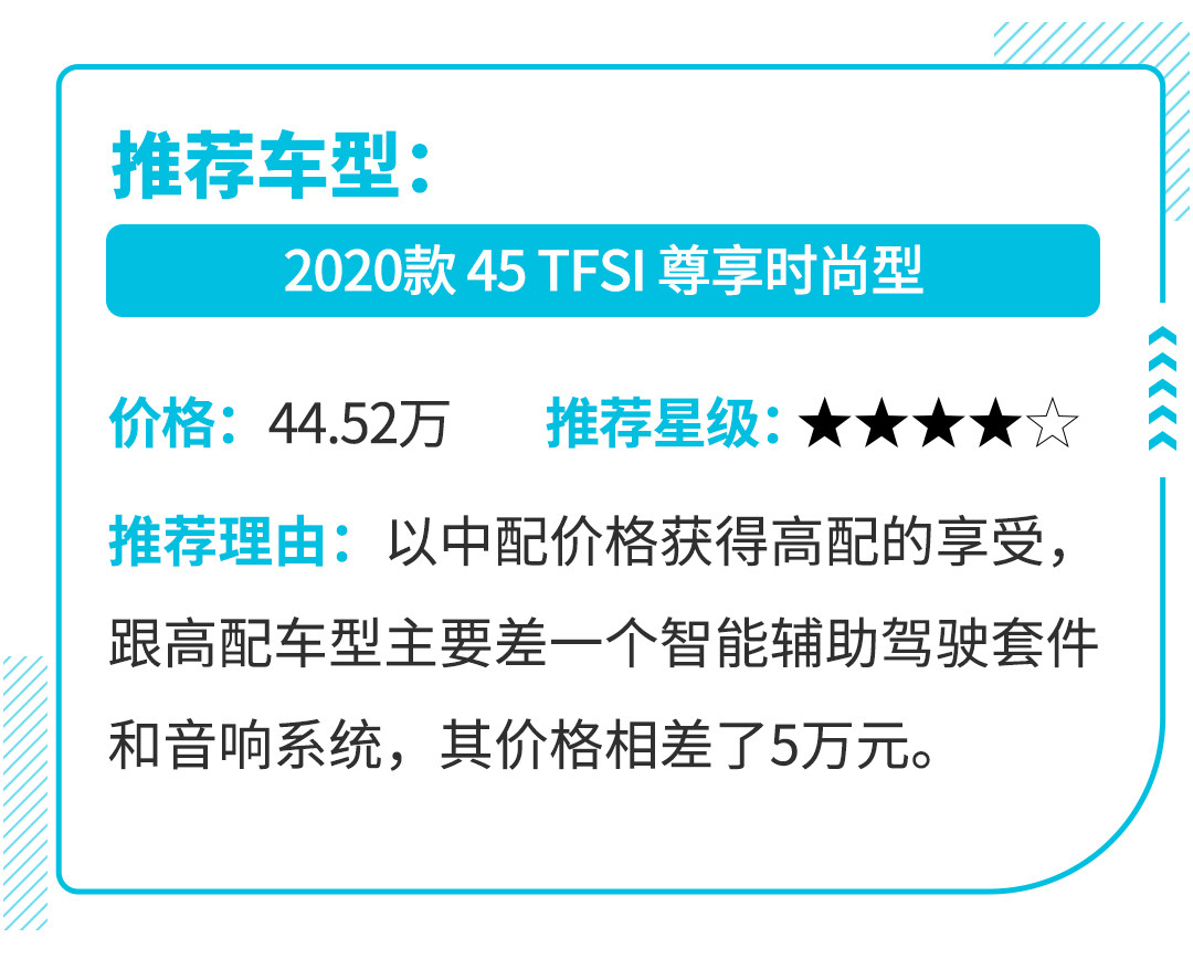 更“全”的方面主要体现在车型配置上。以奥迪Q5L 45 TFSI 尊享时尚型来说,有着更好的动力,更完善的安全配置,更全的功能性配置,最重要的是最合适的价格,以中配价格获得高配的享受,跟高配车型主要差一个智能辅助驾驶套件和音响系统,其价格就相差了近5万元。