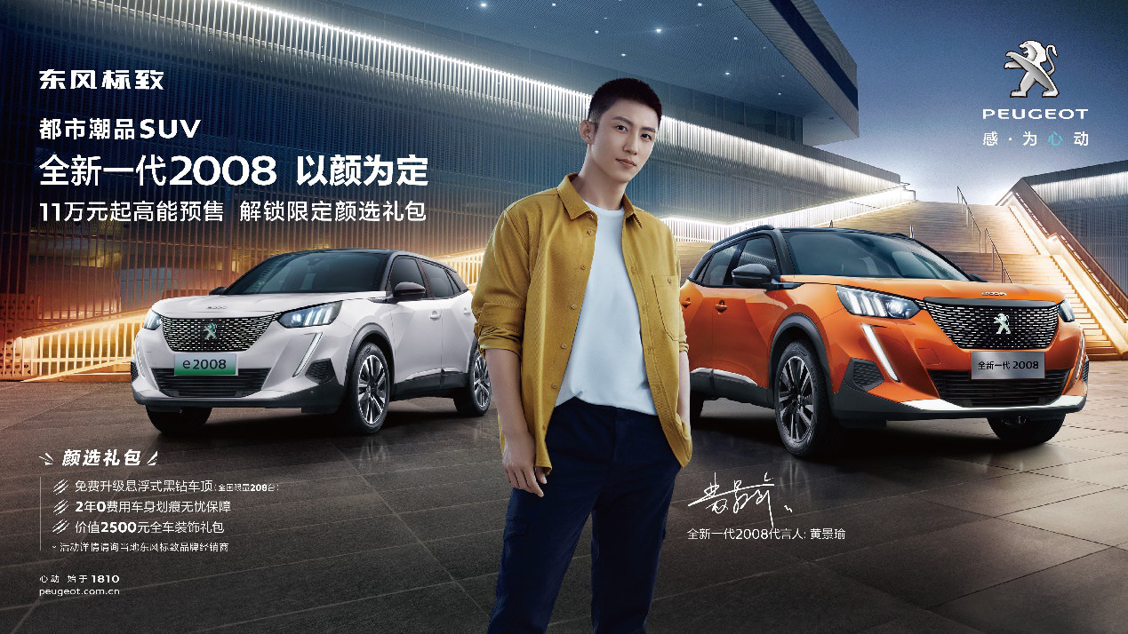 4月20日,东风标致全新一代2008燃油版和电动版同步正式开启预售,其中,燃油版共推出4个级别版本,预售价为11-16万,电动版e2008推出2个级别版本,预售价18万起。同时,东风标致也正式官宣青年演员黄景瑜担当全新一代2008及SUV家族代言人,向消费者传递出拒绝平庸、果敢自由,在追逐向上中秉持自我、尽情享受生活的潮流态度。