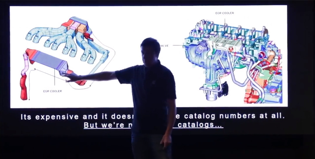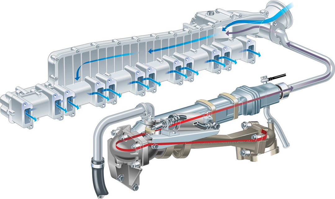 EGR系统,中文名叫废气再循环系统,主要的作用在于改善排放。排气从排气歧管排出时,会有阀门连接着EGR系统的管道,此时可以打开阀门让一部分废气进去管道中,然后再到EGR散热器,EGR散热器是一个水冷式散热器,布置在发动机顶部,废气在被送往进气歧管前,会在散热器进行散热。所以,EGR散热器会给进气歧管增加一些冷却后的气体,但是这个气体里面没有氧气,它不能再参与燃烧,所以把这些冷却的惰性气体和新鲜空气一起送进发动机,所以总体上的氧含量会比较低,也意味着燃烧后的温度会比较低,因为可以燃烧的油比较少。