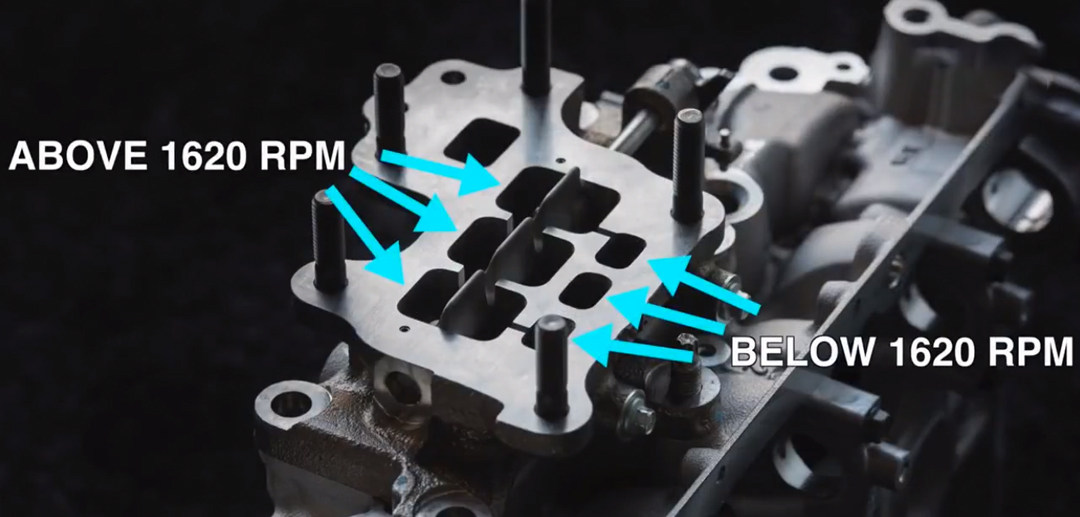 一旦发动机转速超过1620rpm,歧管中的阀门就会打开,为增加的废气流量降低阻力,这时候已经不用担心涡轮是否建压的问题,因为已经有足够多的废气去推动涡轮。所以这个设置在排气歧管中的精巧结构可以帮助涡轮快速起压,降低涡轮建立有效正压的转速,