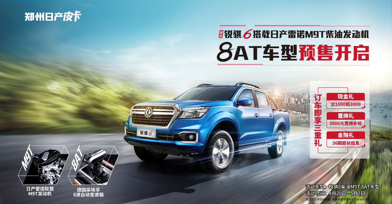 2020年4月20日,郑州日产新款锐骐6国六柴油8AT车型正式开启预售,新车型搭载日产雷诺M9T发动机和采埃孚8AT自动变速箱,并将推出标箱及长货箱两种货箱形式,两驱及四驱版车型。