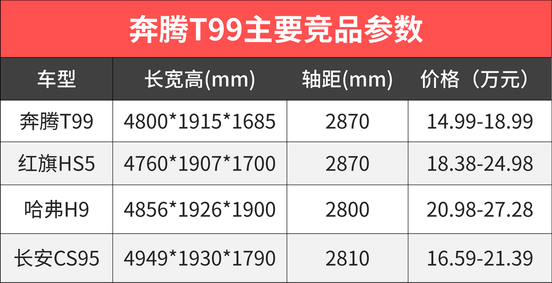 奔腾T99是一汽奔腾推出的一款中大型SUV,它与红旗HS5同平台打造,而价格只为14.99-18.99万,不仅比红旗HS5低了一截,而且跟同级的竞争对手相比,奔腾T99的价格也相当实惠。