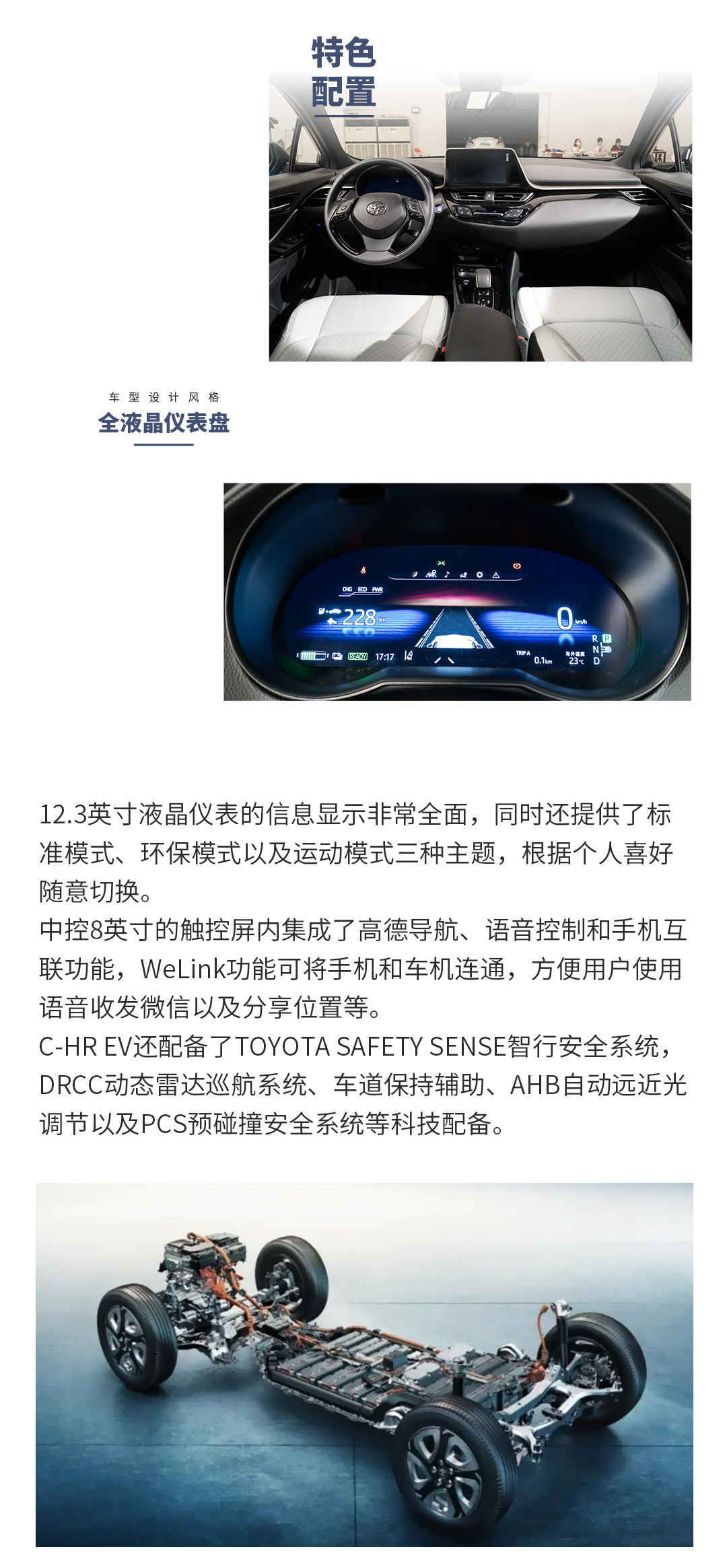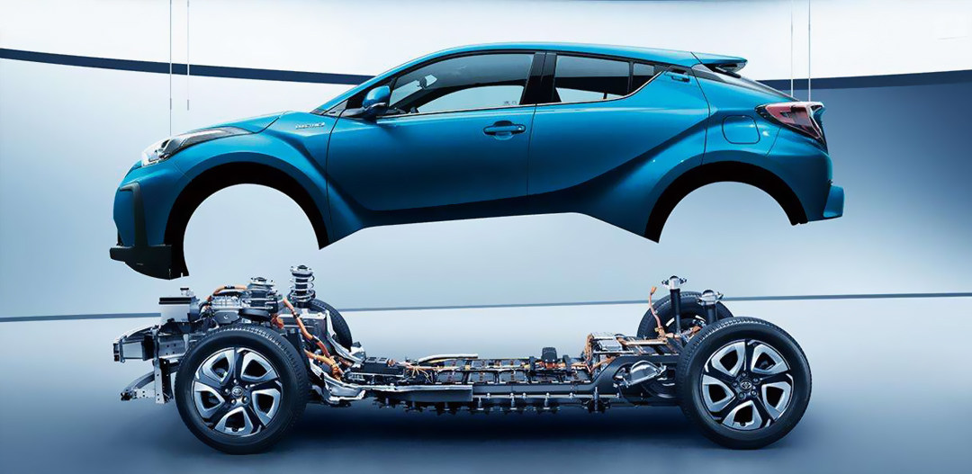 因为新车是基于丰田TNGA架构上打造,所以电池包也设计成车身骨架的一部分,最终进一步提升了车身刚性。也正因为如此,C-HR EV车型实现了在不牺牲车内空间的同时降低了车辆重心。