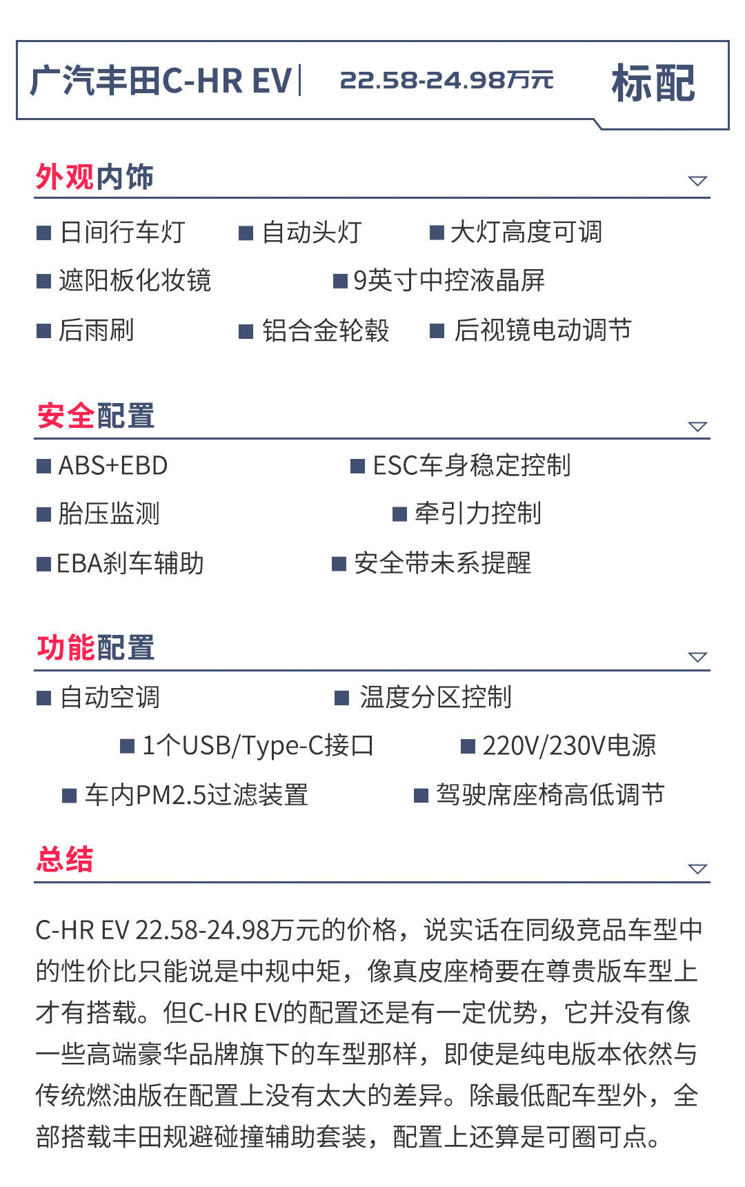 继“双擎(HEV)”、“双擎E+(PHEV)”之后,作为丰田“擎”家族的成员再次新增一名,丰田将EV技术命名为“E进擎(EV)”。4月22日,丰田品牌在华的首款量产纯电动车型C-HR EV上市,补贴后售价为22.58万-24.98万元。