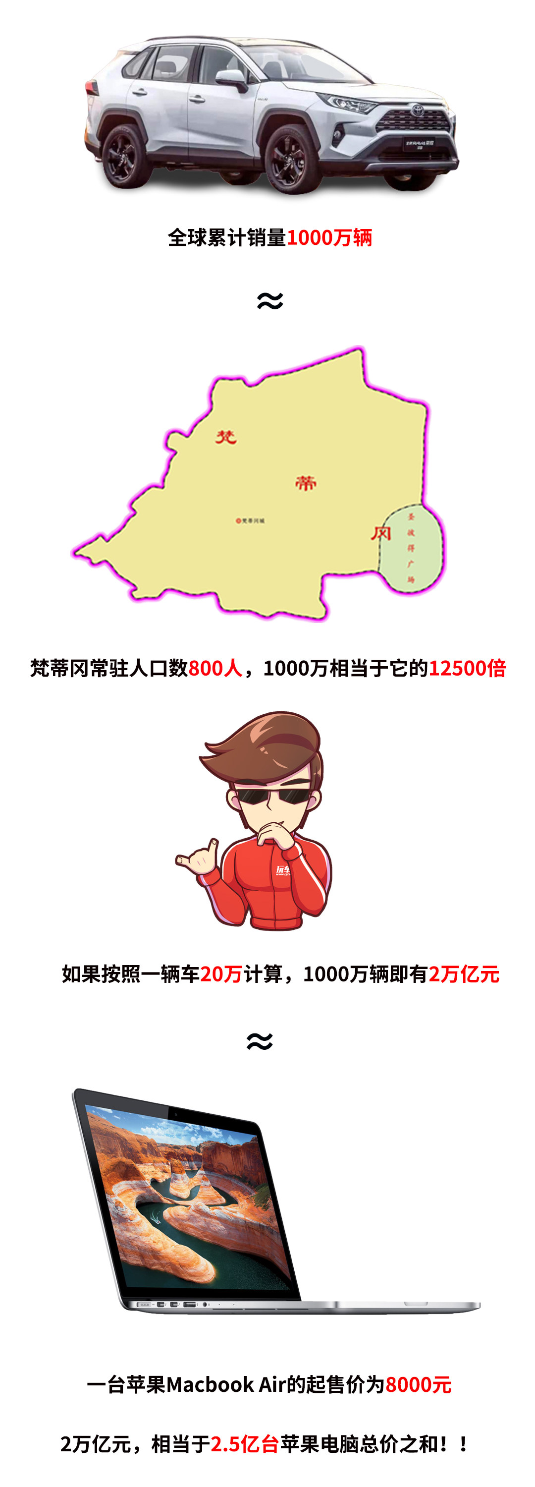 日前,销量榜单上的“常春藤”车型RAV4荣放全球累计销量突破1000万辆,是继凯美瑞、雅阁 、思域之后的又一款千万级销量力作。1000万辆,这个数据有多夸张,或许靠想象没什么概念。