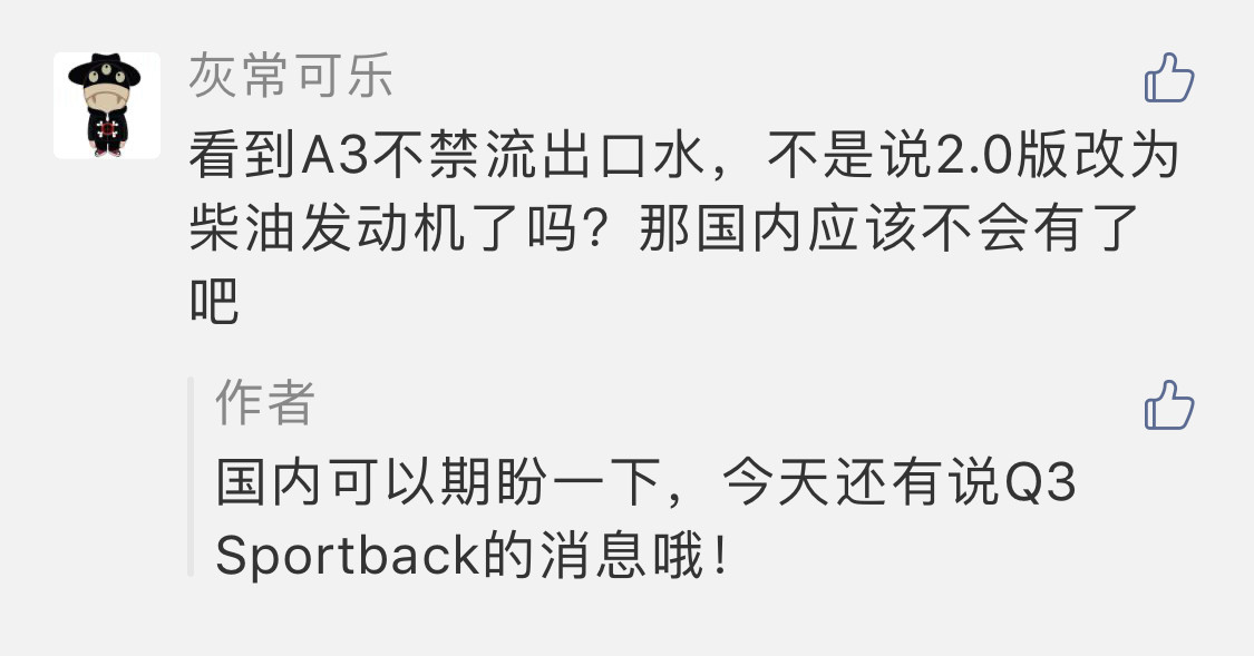看来全新一代A3已经被不少车迷朋友期待了!的确,无论外观还是内饰该车都非常符合年轻人的口味。那不知道今天说的这辆Q3 Sportback你又感兴趣吗?