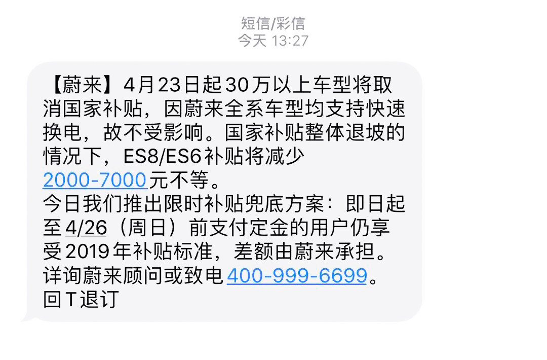 虽然旗下车型全系支持快速换电,并没受此次补贴退坡的影响,但蔚来官方在政策发布后,也及时通过短信的方式通知了潜在车主客户,并推出了"限时补贴兜底方案"。
