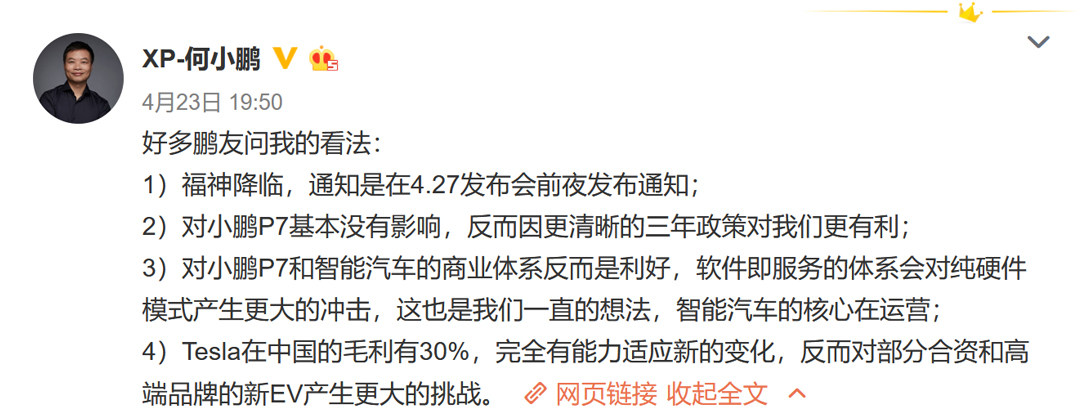 无独有偶,同样在最近有新车即将发布的小鹏汽车,相关负责人也在政策发布后通过网络平台进行了反应。教授庆幸小鹏P7的发布会是定在4月27日,新政在发布会前进行通知,并且还清晰地列出了三年政策,那意味着对P7车型的商业体系是利好的。相信届时新车的售价一旦公布,那无疑又是一阵“真香”味道。