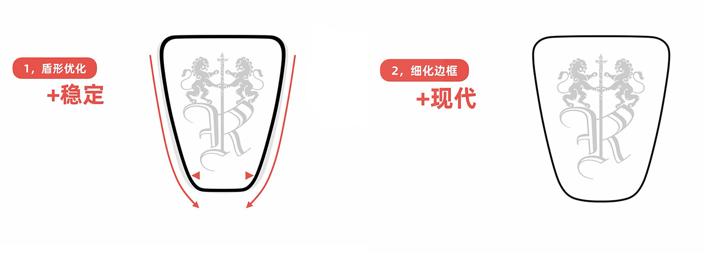 新狮标依然采用盾型、双狮护华、以及花体字母R元素组成,但在多方面优化下更简约也更醒目,识别度更高。盾型部分也变得更为细长,下方圆弧度变小,视觉观感就显得四平八稳般稳定。边框则进行了细化,更符合如今审美需求,并且也是一种简约化表现。