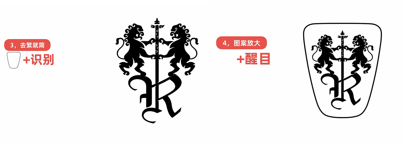 双狮护华以及花体R元素,对细节进行了修改,并且放大了这些设计元素,整体观感更协调更醒目,自然更容易识别。
