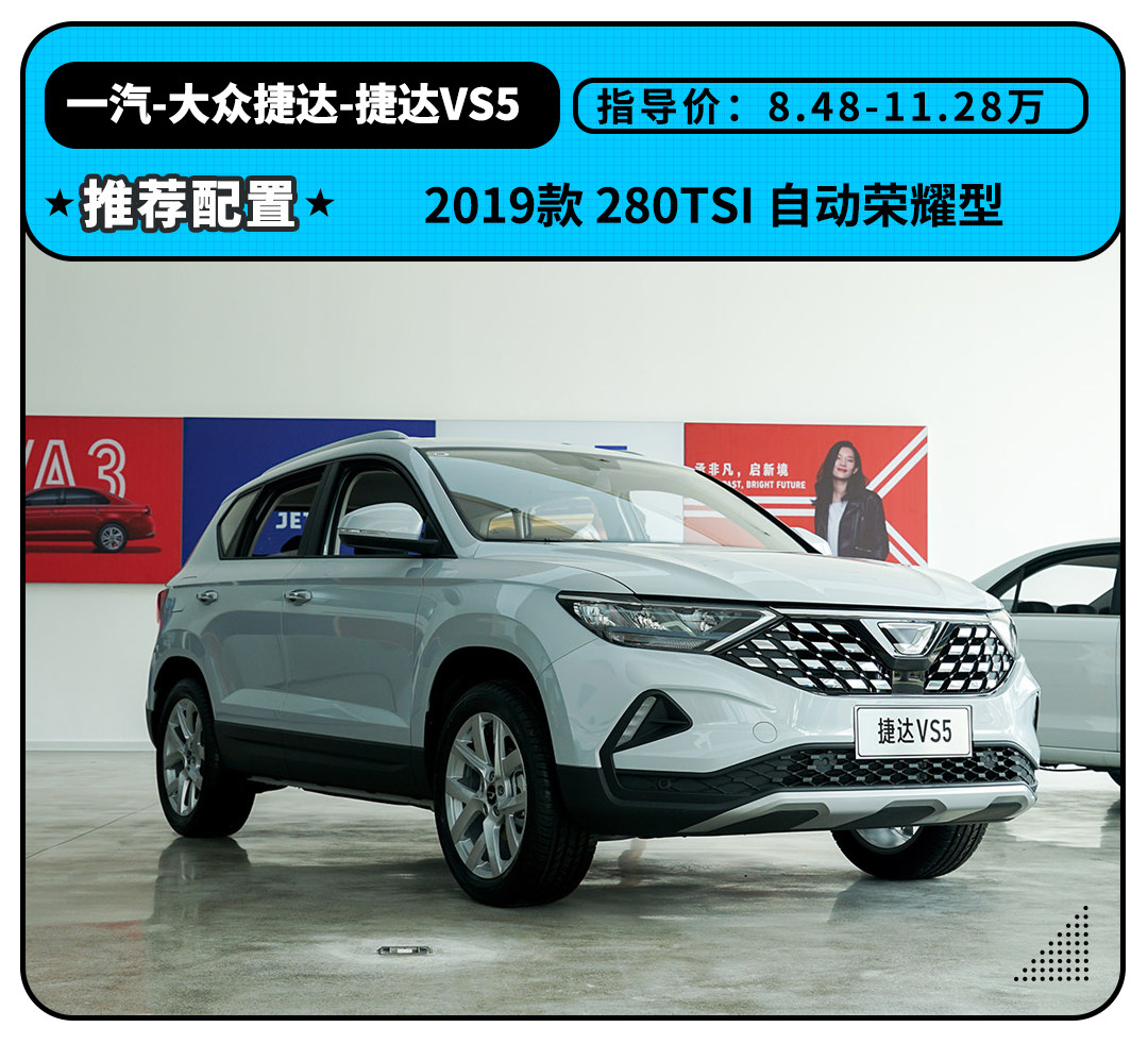 其中捷达VS5比较推荐的车型版本是顶配的自动荣耀型,主要原因还是在于更高的产品配置上,前后排头部气囊以及主动刹车的安全配置,以及天窗和自动空调的舒适性配置都是自动荣耀型上才有所搭载。虽然对比次顶配的自动悦享型高出1万元的售价,但这些配置的需求还是存在的。