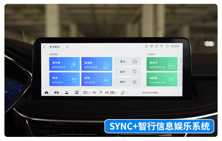 中控屏搭载了SYNC+系统,该系统内置了多种功能,包括看电影(附近电影院)、饿了有美团外卖、查机票、查航班以及爱奇艺视频等。要使用这些功能必须登录账号,所以本次教授没有体验过。比较奇怪的是,连语音识别这一功能也要登录账号才能解锁。锐际的中控屏触控非常流畅,比不少国产车的屏幕更好。