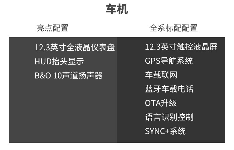 12.3英寸的中控屏是全系标配,附带的SYNC+智能系统也同样是标配,这套系统支持语音识别控制、OTA升级、GPS导航和车载联网等功能。作为顶配的ST-LINE版本,它还有HUD抬头显示和B&O音响。