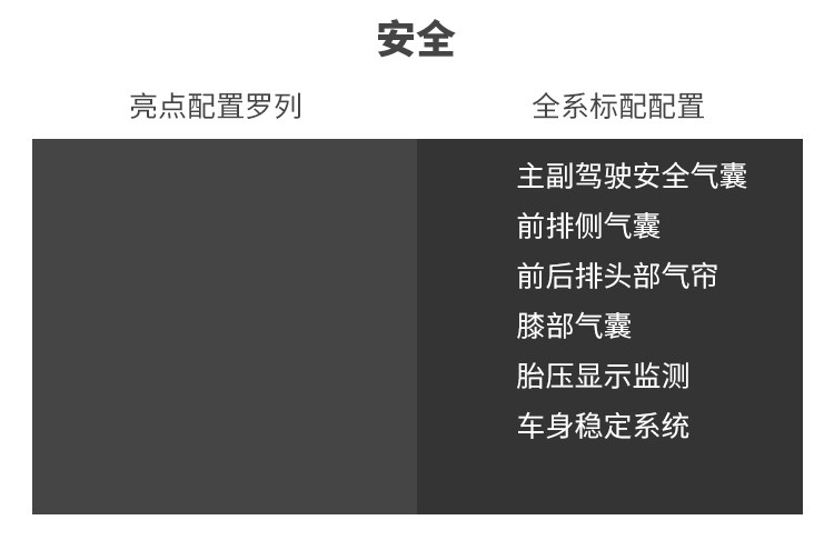 锐际标配了主副驾驶安全气囊、前排侧气囊、前后排头部气帘和膝部气囊总共7个安全气囊。