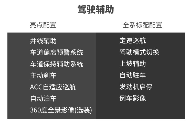 锐际的驾驶辅助配置率其实非常高,达到了60%,只要你不是选两驱和四驱的最低配,那么你就可以拥有上表左边的配置。