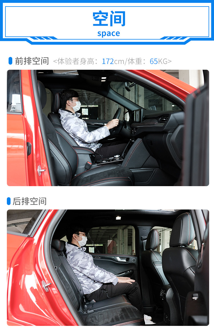 锐际的乘坐空间表现比翼虎有着长足的进步,以图中的模特坐进锐际当中,锐际的前排头部空间有两拳,而后排的腿部空间有一掌加一拳,可谓是非常宽敞。