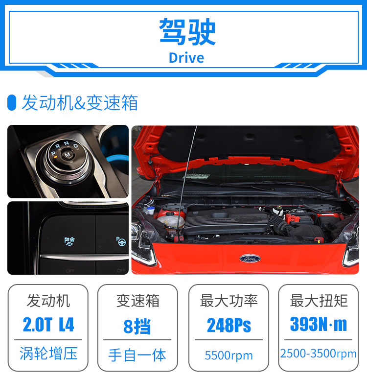 福特锐际全系标配2.0T+8AT的组合,发动机最大功率248匹马力,最大扭矩393牛·米,比翼虎的2.0T增加了11匹马力和43牛·米的扭矩,且满足国六排放。8AT是福特自主研发的自动变速箱,在ST-LINE上才有手动模式。